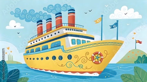 A colorful cartoon vector illustration of a ship sailing on the sea with waves