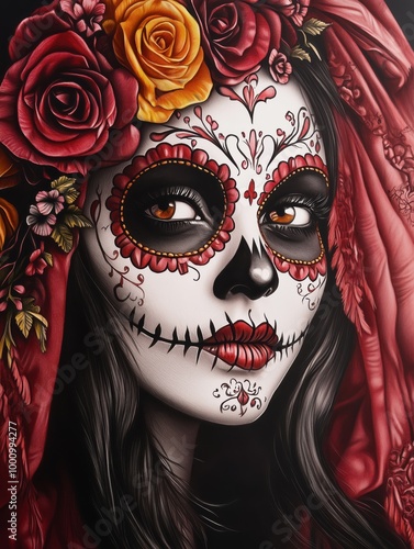 A colorful Día de los Muertos painted face adorned with roses, celebrating tradition and beauty.
