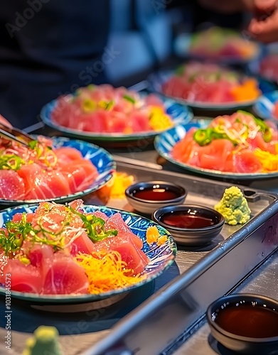 A colorful display of sashimi with garnishes and dipping sauces on decorative plates.