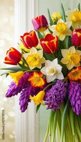 A colorful mix of vibrant spring flowers, red and pink tulips, yellow daffodils and purple hyacinths with lush green leaves. Bouquet for Valentine's day, women's day or mother's day