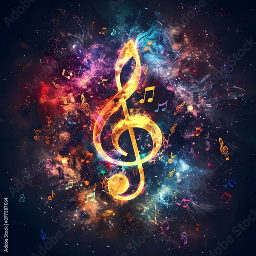 A colorful musical note with many other notes surrounding it. The note is the key to the music