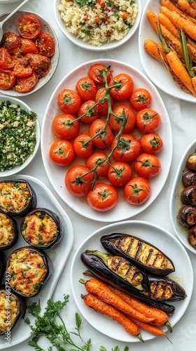 A colorful spread of vegetable dishes showcases stuffed eggplant, grilled carrots, and ripe tomatoes, ideal for a healthy meal or gathering