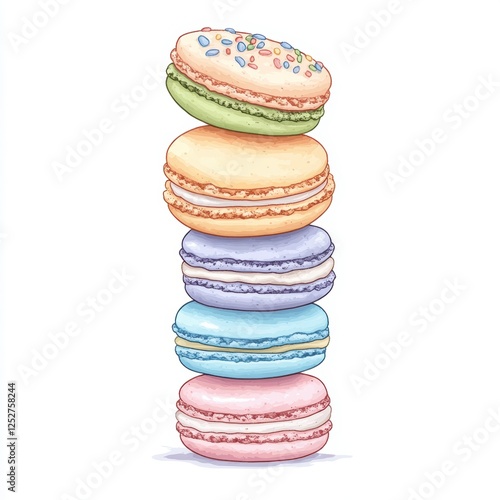 A colorful stack of five macarons in various pastel shades, showcasing a delightful assortment of flavors and a whimsical design.