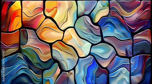 A colorful stained glass window with a mosaic pattern. The colors are bright and vibrant, creating a sense of energy and excitement. The window is made up of many small pieces, which gives it a unique