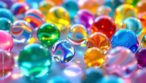 A Colorful Symphony of Marbles: A vibrant close-up showcasing a collection of iridescent, multicolored marbles, each reflecting light in a dazzling display of color and texture.