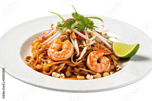 A colorful Thai seafood pad Thai dish with stir-fried noodles, shrimp on a white plate against a plain white background