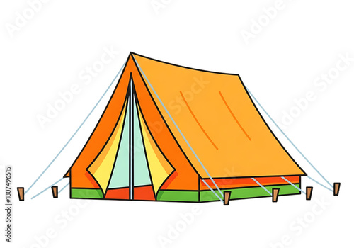 A colorful vintage style canvas tent with poles and ropes isolated on transparent background