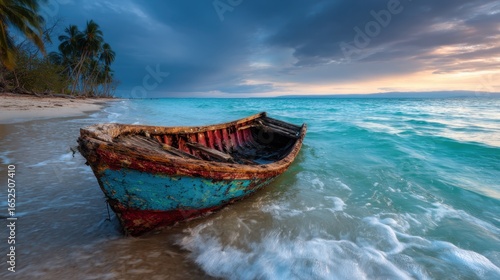 A colorful, weathered boat rests on the shore as waves gently lap at it, illuminated by a stunning tropical sunset over the serene ocean landscape, capturing a moment of tranquility.
