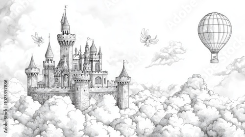 castle, fantasy, cloud, floating, hot air balloon, illustration, magic, scenic, nature, architecture, sky, adventure, whimsical, fairy tale, art, landscape, dreamy, surreal, peaceful, escape, journey, travel, beauty, elegance, light, contrast, enchantment, creativity, inspiration, design, unique, stunning, artistic, vintage, imagination, character, storytelling, skyline, detail, daydream, aethereal, soft, monochrome