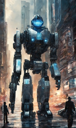 A colossal blue-headed robot towers over a rain-drenched city street, casting an imposing silhouette against the tall urban skyline, as pedestrians look on in awe.. AI Generation