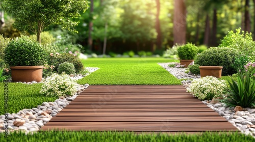 A combination of artificial grass and wooden decking with stylish plant pots