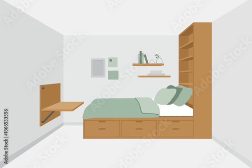 bedchamber, interior, furniture, bed, desk, bookshelf, storage, compact, efficient, modern, minimalist, student, apartment, room, organisation, design, contemporary, functional, clean, tidy, home, living, wooden, wall, shelf, decor, simple, domestic, residential, cosy, organised, neat, uncluttered