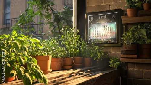 A compact urban garden on a fire escape, where potted herbs thrive alongside a holographic calendar display. Ample room for text at the bottom of the image.