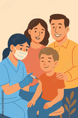 nurse, boy, children, family, vaccination, injection, immunisation, health care, medicals, clinic, doctor, patient, prevention, protection, wellness, health, care, pediatric, childhood, support, trust, medicine, public health, immunity, syringe, happy, smiling, positive, well-being, healthy, illustration, vector, graphic, cartoon, modern, digital artwork, medical care