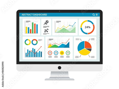 A computer monitor displays a dashboard with various colorful charts and graphs on a white background