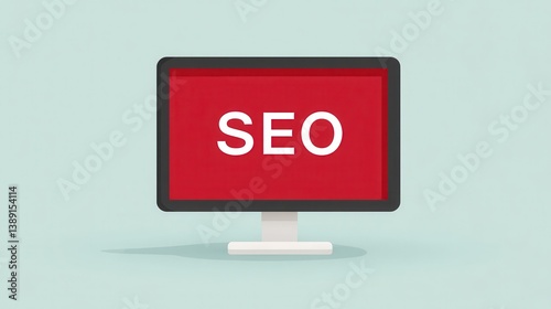 A computer monitor displays the word "SEO" on a red background, symbolizing digital marketing and search engine optimization concepts.