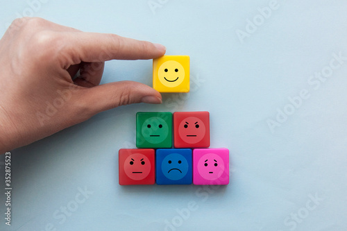 A conceptual image of cubes and various emotions on them: joy, sadness, anger, sadness, calm. The advantage of positive thinking