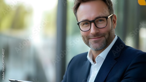 man, suit, blue, confident, professional, smiling, goggles, businessman, portrait, fashion, style, formal, attaching, white, shirt, office, corporate, executive, leader, successful, photogenic, sharp, clean, crisp, groomed, beard, stubble field, grey, hair, closeup, casual attire, relaxed, modern, background, blur, sharpened, depth, field