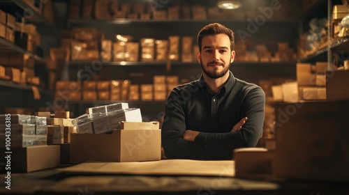 A confident man stands among stacked boxes in a dimly lit warehouse, showcasing a sense of ownership and control in a busy storage environment.