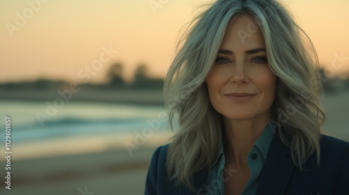 A confident woman with flowing hair standing near a beach at dusk, exuding leadership, inner strength, and a harmonious connection to nature