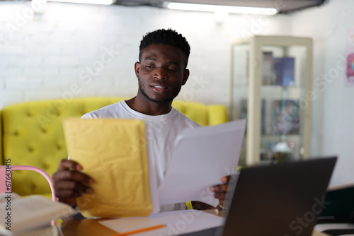 A confident young businessman in a modern office, working on a laptop and reading documents, reflecting a successful and professional career.