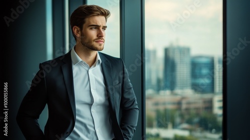A confident young businessman in a sharp suit standing by a large window in a modern office, looking out over the cityscape with a thoughtful expression.