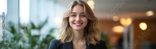 A confident young businesswoman smiling in a modern office, portraying professionalism and warmth. Ideal for business-related content.