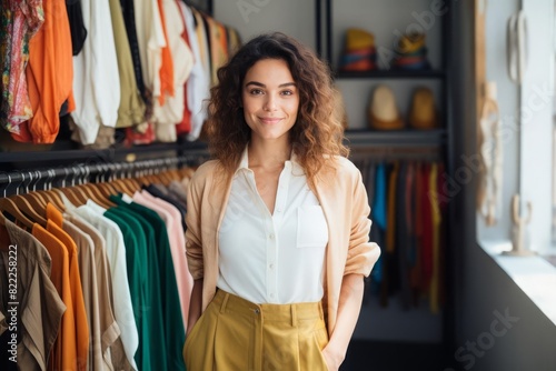 A confident young woman standing in her boutique, wearing a stylish outfit with overalls and a white shirt The background features a clothing rack with colorful garments, highlighting her role as a fa