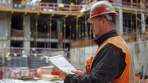 A construction worker in a hard hat and safety vest studies plans at a construction site, emphasizing the importance of organization and attention to detail in building projects.