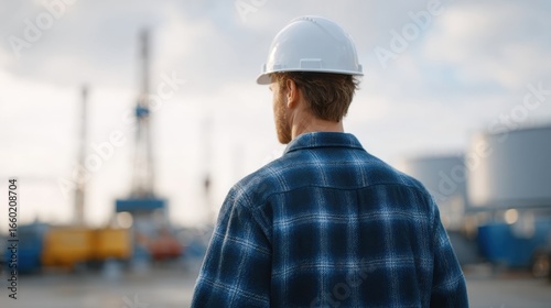 A construction worker in a safety helmet stands in an industrial setting, observing the machinery and surroundings, embodying the essence of hard work and dedication in the industr