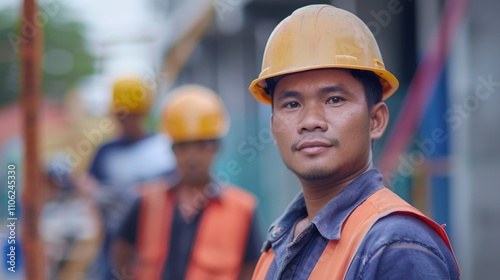 A construction worker in a yellow hard hat and orange safety vest with a blurred background Of Other workers and construction equipment.