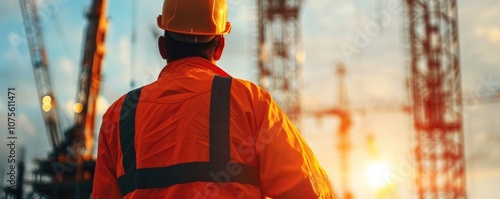 A construction worker in an orange safety jacket and helmet observes a dynamic construction site against a sunset backdrop.