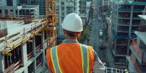 A construction worker in high visibility clothing surveys cityscape developments, depicting industry and urban growth