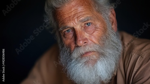 A contemplative elderly man with a thick beard and grey hair gazes thoughtfully outside a dark frame, suggesting a rich internal world and deep personal reflections about life.