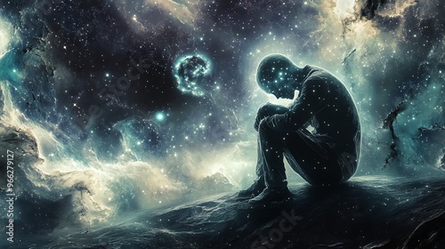 A contemplative figure in a cosmic scene, surrounded by stars and galaxies, symbolizing introspection and the vastness of existence.