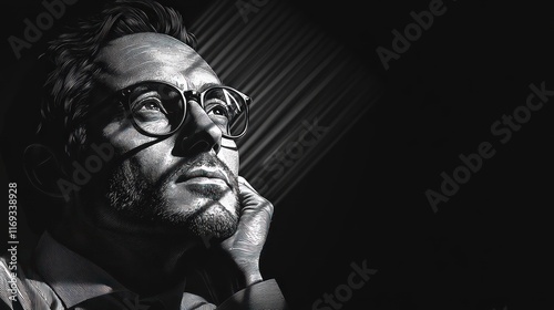 man, portrait, light, shadow, expression, contemplation, goggles, thinking, emotion, profile, monochrome, artistic, depth, contrast, serious, introspective, sharpened, gaze, mood, creativity, inspiration, design, photo, elegance, style, character, silhouette, beauty, detail, intensity, calm, sophisticated, modern, vision, narrative, atmosphere, dramatic, timeless, concept, human, realism, expressionism, insight, perspective