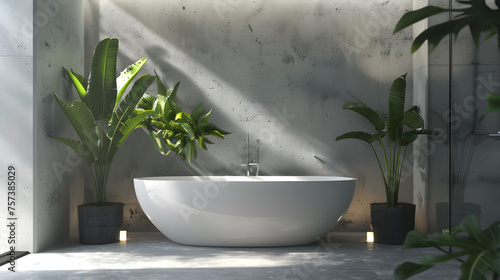 A contemporary bathroom design featuring a white freestanding bathtub surrounded by lush green plants in a serene setting with natural light