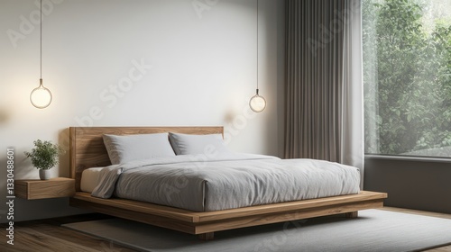 A contemporary bedroom featuring a wooden bed frame with a light grey bedding set