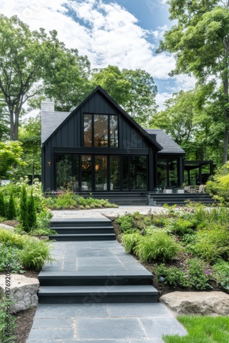 A contemporary black house elegantly stands amidst vibrant, lush greenery, featuring a picturesque pathway that guides visitors to its entrance under the warm glow of a sunny day