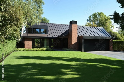 modern, house, brick, exterior, black, roof, manicured, lawn, suburban, neighbourhood, bright, daylight, contemporary, design, lush, greenery, residential, architecture, view, clean, line, peaceful, setting, space, landscaping, family, home, stylish, property, architectural, feature, sunlight, charming, luxury, residence, green, driveway, suppressing, attracted, nature, relaxing, environment, inviting, atmosphere, urban, living, beautiful, surrounding
