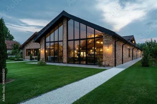 modern, house, brick, architecture, glasses, window, landscaped, garden, rural, setting, twilight, evening, serene, atmosphere, contemporary, design, residential, space, home, peaceful, greenery, lighting, pathway, nature, relaxing, environment, roomy, layout, lifestyle, landscaping, brick, structure, calmness, inviting, yard, exterior, charme, light, comfortable, beautiful, style, retreat, housing, craftsmanship, country, elegant, scenic