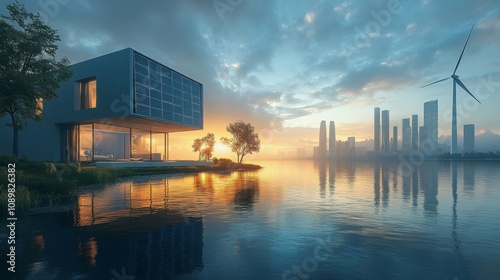 modern, architecture, contemporary, home, sunrise, tranquil, water, wind, futuristic, city, glasses, window, sleek, design, urban, landscape, nature, environmental, sustainability, skyline, reflections, horizon, peaceful, setting, green, energy, waterfront, property, residential, landscaping, dramatic, sky, ambient, light, vision, innovative, structure, living, scenic, beauty, architectural, dawn, atmosphere, development, view, integration, generative, ai