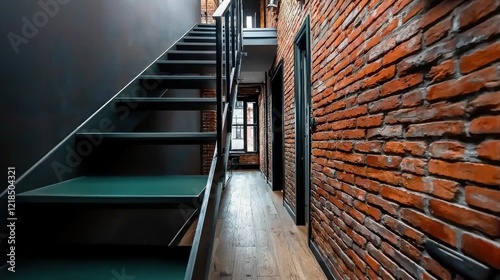 A contemporary industrial-style apartment with exposed brick walls, steel stairs, and minimalist decor