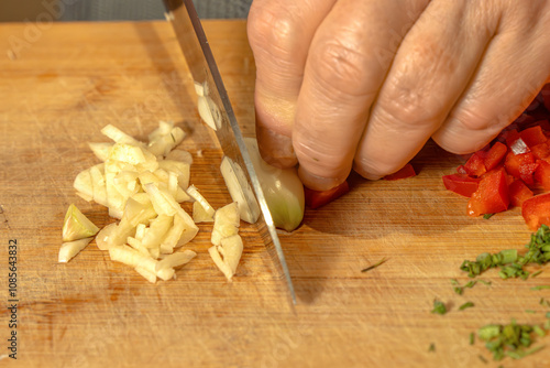 A cook cuts fresh garlic into thin strips on a wooden cutting board. Close-up