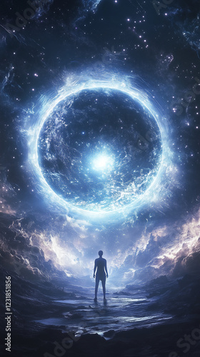 A cosmic fantasy portal floating in deep space, surrounded by swirling nebulas, shimmering stars, and a celestial figure in ethereal lighting, ultra-HD, fantasy art, vertical ratio 16:9