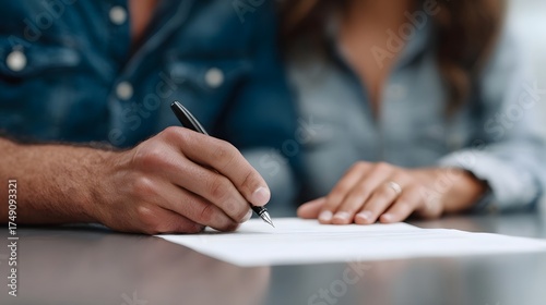 couple, signing, joint, investment, agreements, writing, document, paper, pen, hand, hand, partnership, contract, legal, business, finance, commitment, decision, planning, transaction, approval, consent, togetherness, human relationships, adult, human, person, professional, serious, trust, formal, casual attire, closeup, detail, sharpened, sharp, surface, table, indoor, modern, simple, ink, page, sheet, wedding, marriage, future, secure, strategy