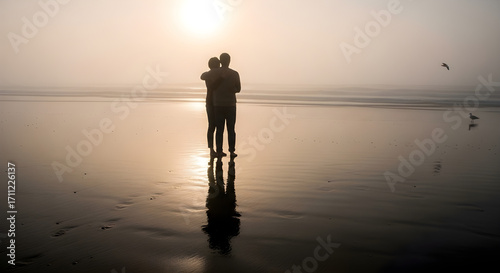 A couple stands in a gentle embrace on a misty beach at sunrise, their silhouettes reflected in the wet sand, evoking romance, serenity, togetherness, and the quiet beauty of a tranquil coastal mornin