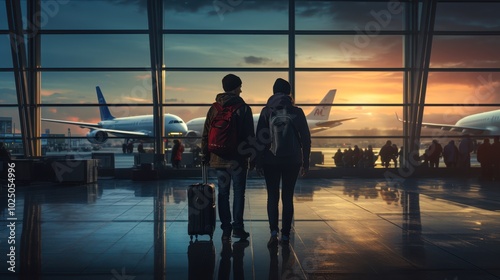 A couple stands together in an airport, watching planes against a colorful sunset backdrop, This image is ideal for travel-related content, showcasing anticipation and connection,