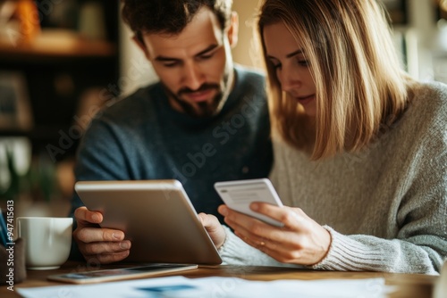 A couple using an online banking app on a tablet to plan their budget and track expenses, symbolizing the collaborative and accessible nature of digital financial tools