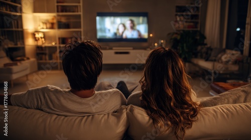 couple, watching, motion picture, television, relaxing, sofa, living room, night, indoor, home, entertainment, leisure, together, couch, screen, viewing, domestic, evening, cosy, enjoyment, shared, activity, illumination, low light, comfort, relationship, modern, furniture, interior, lifestyle, streaming, broadcasting, transmission, reception, signal, grooved, program, show, series, film, cinematic